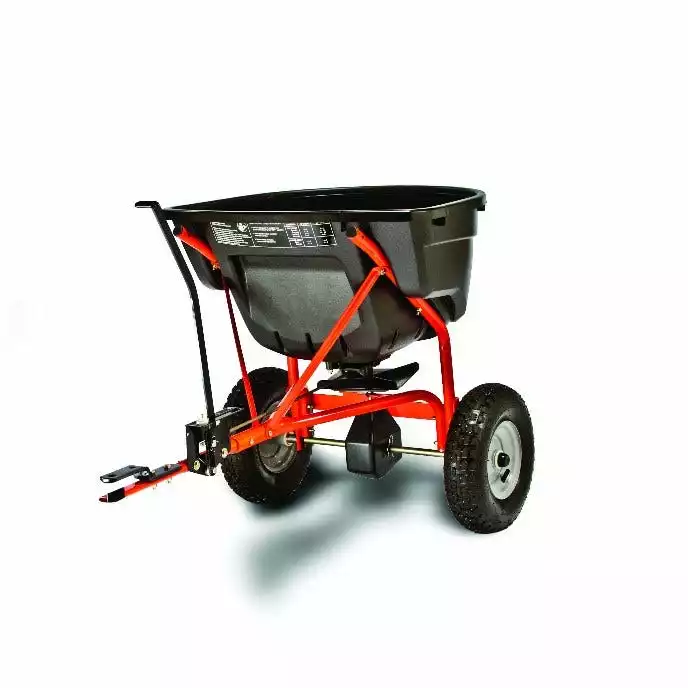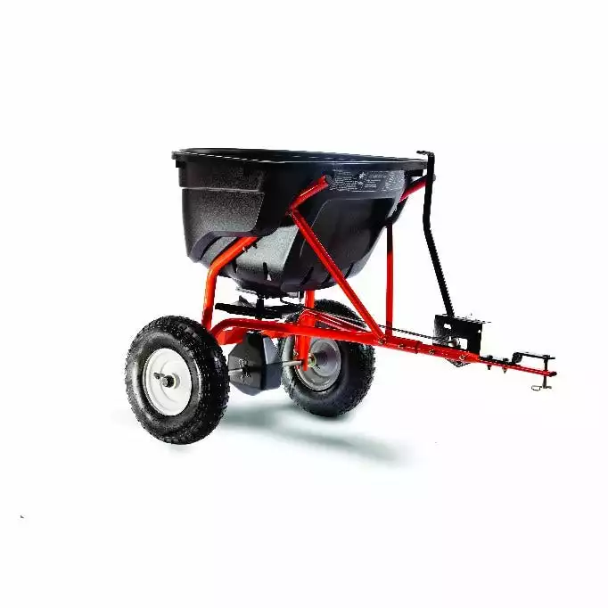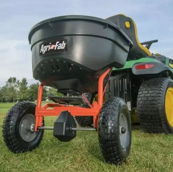 - The spreader holds up to 130 lb. of product and features a hitch that is compatible with most lawn tractors