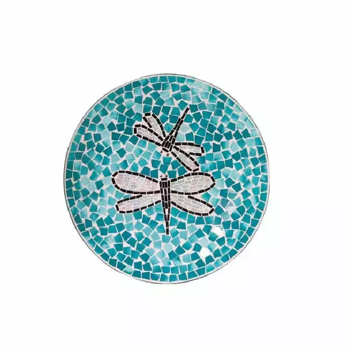 Beautiful 18″ diameter glass mosaic bird bath is uniquely designed with iridescent pieces of glass to form a dragonfly duo amidst hues of blue tiles. Includes a metal stand.
