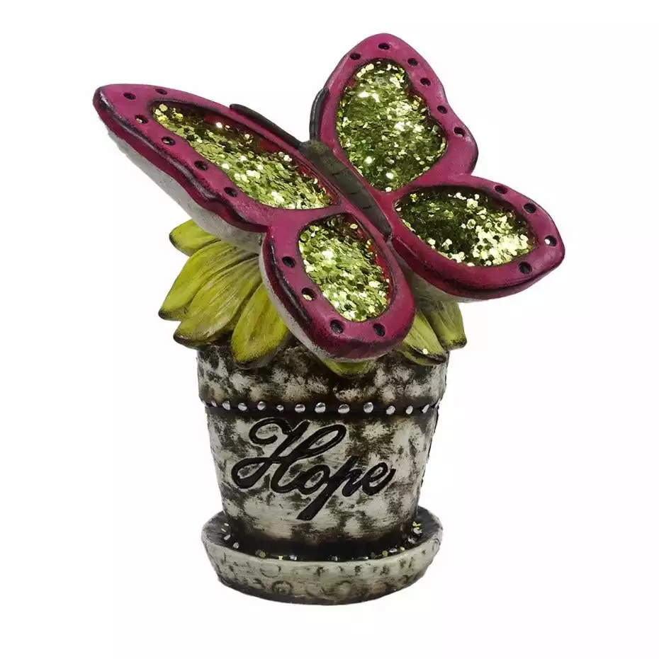 Evoke an optimistic sense of hope with this glittered butterfly watering can statue. The pleasing combination of a vintage looking watering can with a stunning, shimmering butterfly is sure to bring about a relaxing and enjoyable outdoor experience!