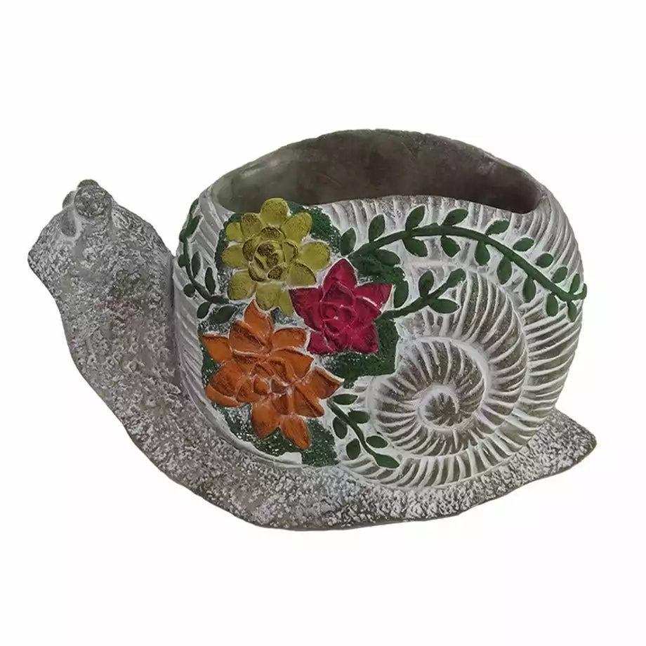 Refresh your garden or outdoor space with this beautiful and adorable design. Made from cement, this sweet gray floral snail pot planter features a colorful botanical design, and is a perfect addition to your patio, garden or backyard!