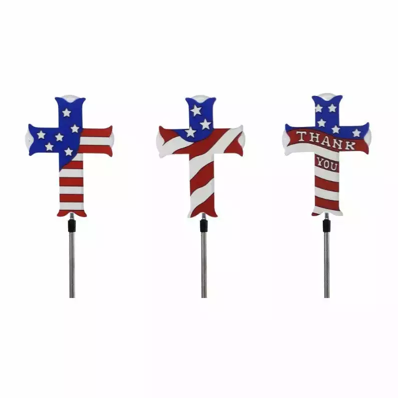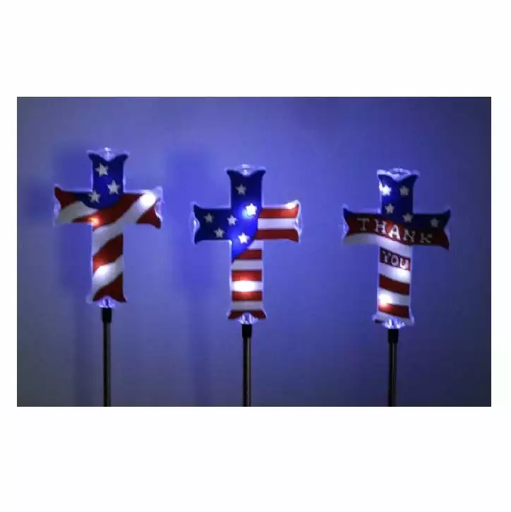 A great way to remember a loved one with this solar patriotic cross garden stake! Designed with red, white and blue stars and strips, this stake needs no electricity. Charge by day and it lights up by night!