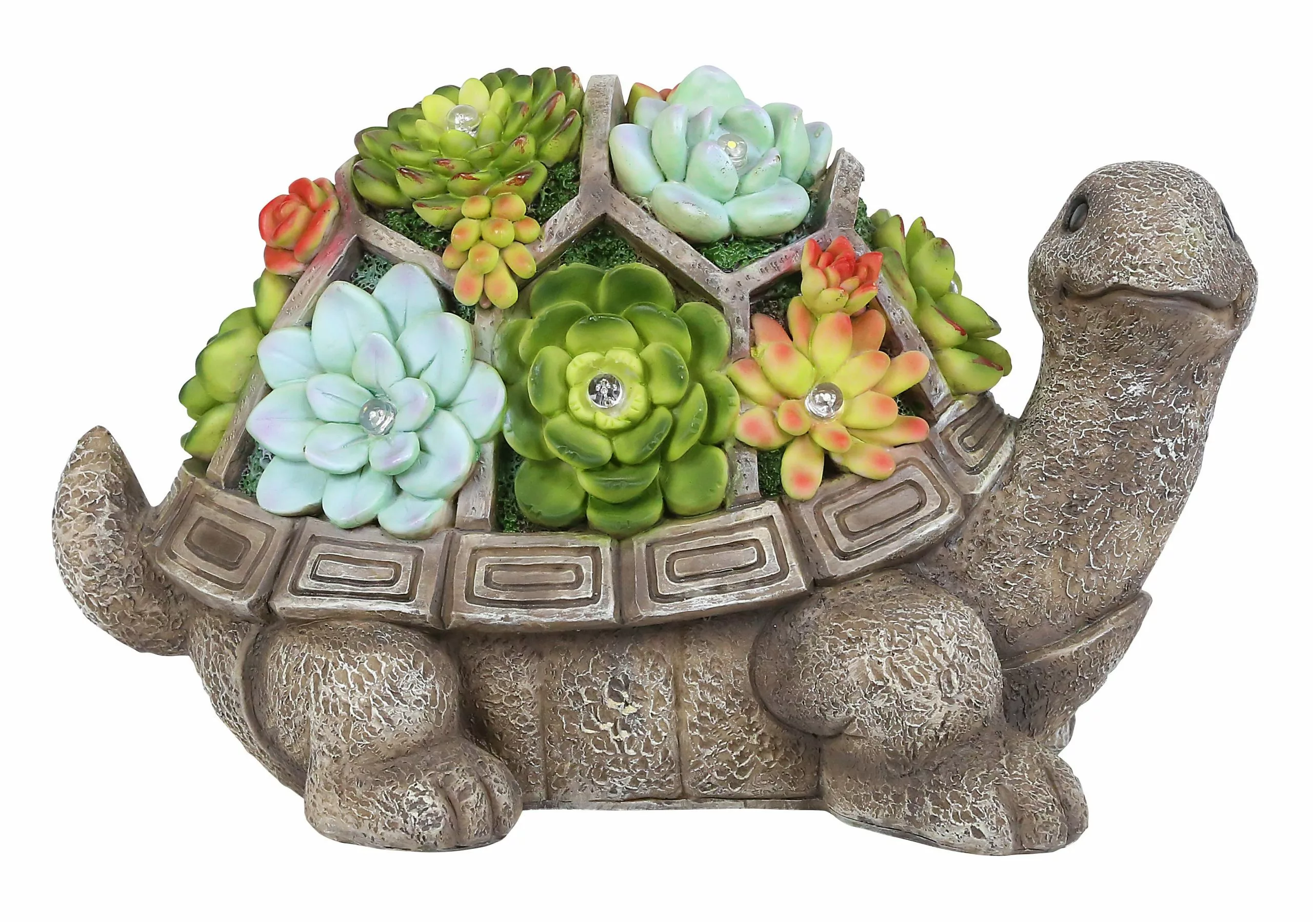 These turtle statues feature succulent flowers lit by solar powered LED lights creating a beautiful display of color. Solar panel provides up to 8 hours of power on a full charge.