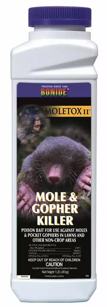 This mole and gopher killer protects your lawn from unsightly mounds and ridges. Moles and gophers prefer the taste and texture of Moletox II Mole and Gopher Bait to other baits, so itβs more effective than pellets. This exclusively formulated bait has a unique cracked-corn base, making it more palatable to the pests