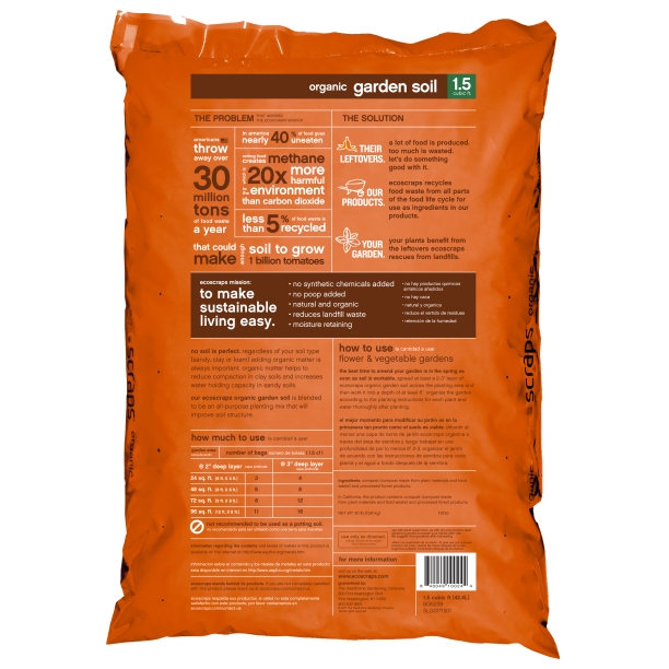 Ecoscraps Organic Garden Soil is derived from a unique blend of fruits, vegetables and other organic materials. A garden soil for all types of in-ground planting applications. Superior to topsoil with its exclusive blend of compost and forest products. Organic with no added poop or synthetic chemicals. Use when preparing soil in outdoor gardens and landscape beds.