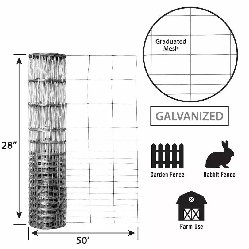 28 in x 50 ft. galvanized rabbit guard is great for keeping rabbits and other varmints out of your garden or other unwanted areas. The fencing features a galvanized coating for added durability and to help prevent rusting and corrosion. The fencing is designed so that the welded mesh openings become smaller at the bottom making it hard for rabbits and other varmints to squeeze through the openings. Rabbit guard is an economical solution that is easy to install and alter to meet your needs.