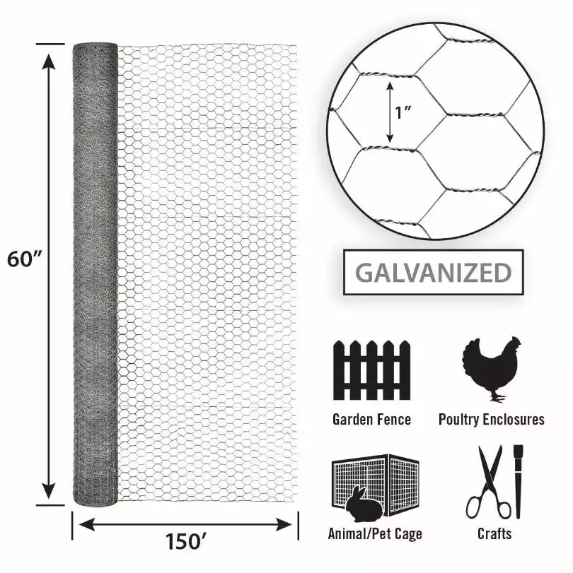 60 in x 150 ft galvanized poultry netting features a 1 in hexagonal mesh weave and is both lightweight and durable. This is an extremely versatile product that can be used for a number of applications, including animal containment, temporary fences, chicken coups and cages, and craft projects. It provides great protection and support for plants, erosion control, and compost containment. Poultry netting is an economical solution that is easy to install and alter to meet your needs.
