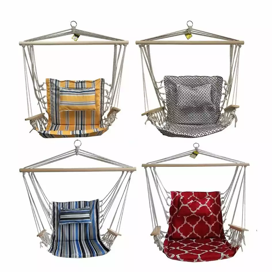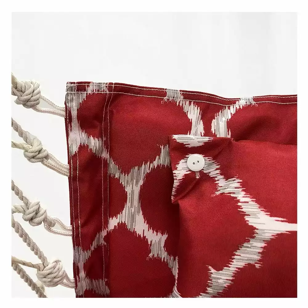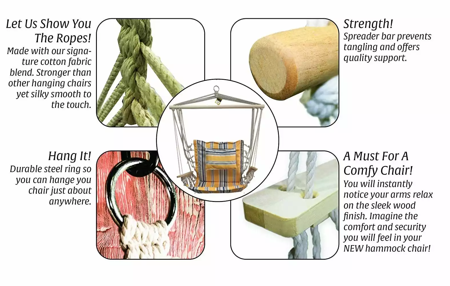Curl up and relax in this cozy hanging chair. The cushions along with attached pillows are durable and comfortable providing a cozy oasis wherever you decide to hang your chair. Chairs can be hung from porches, trees, or even inside your home.