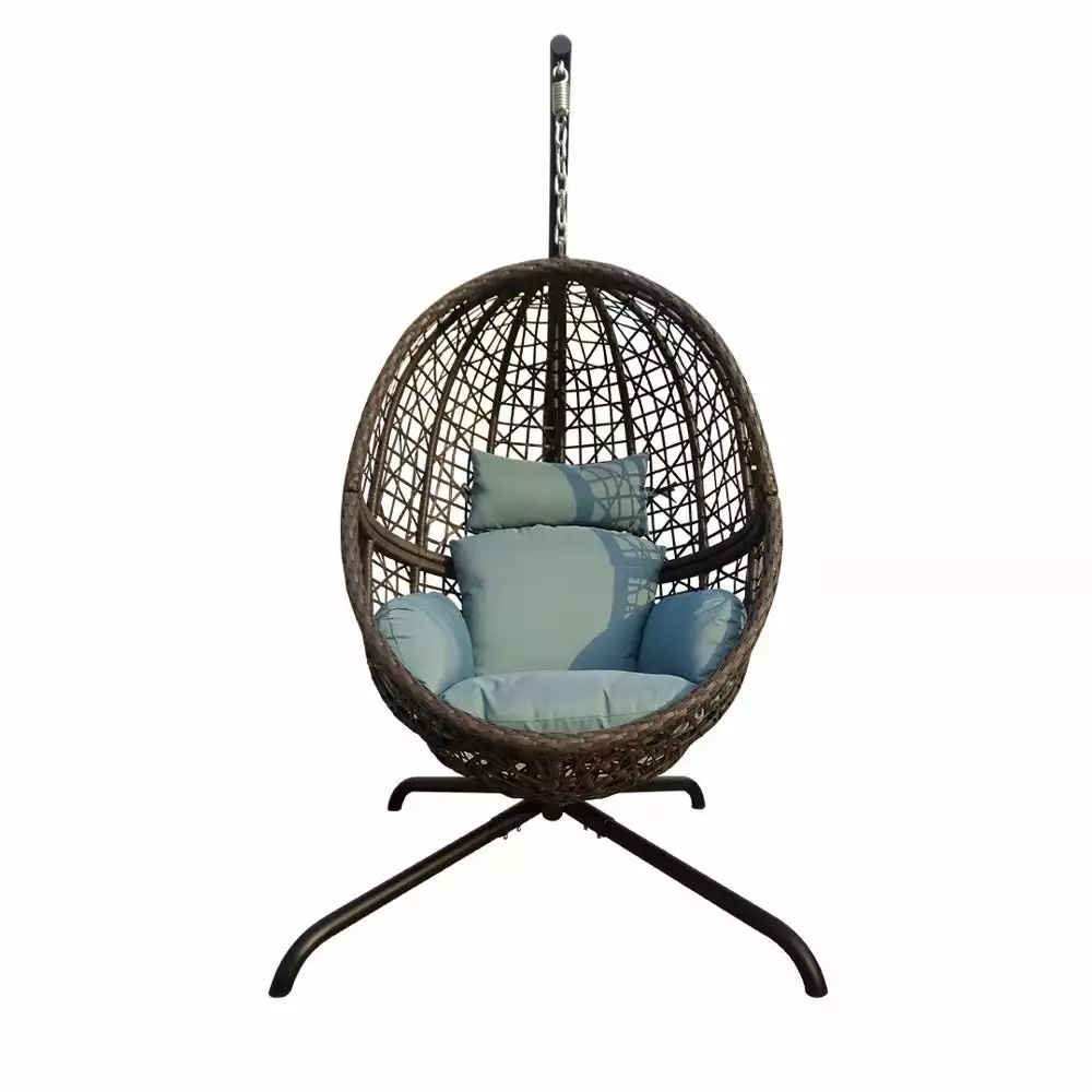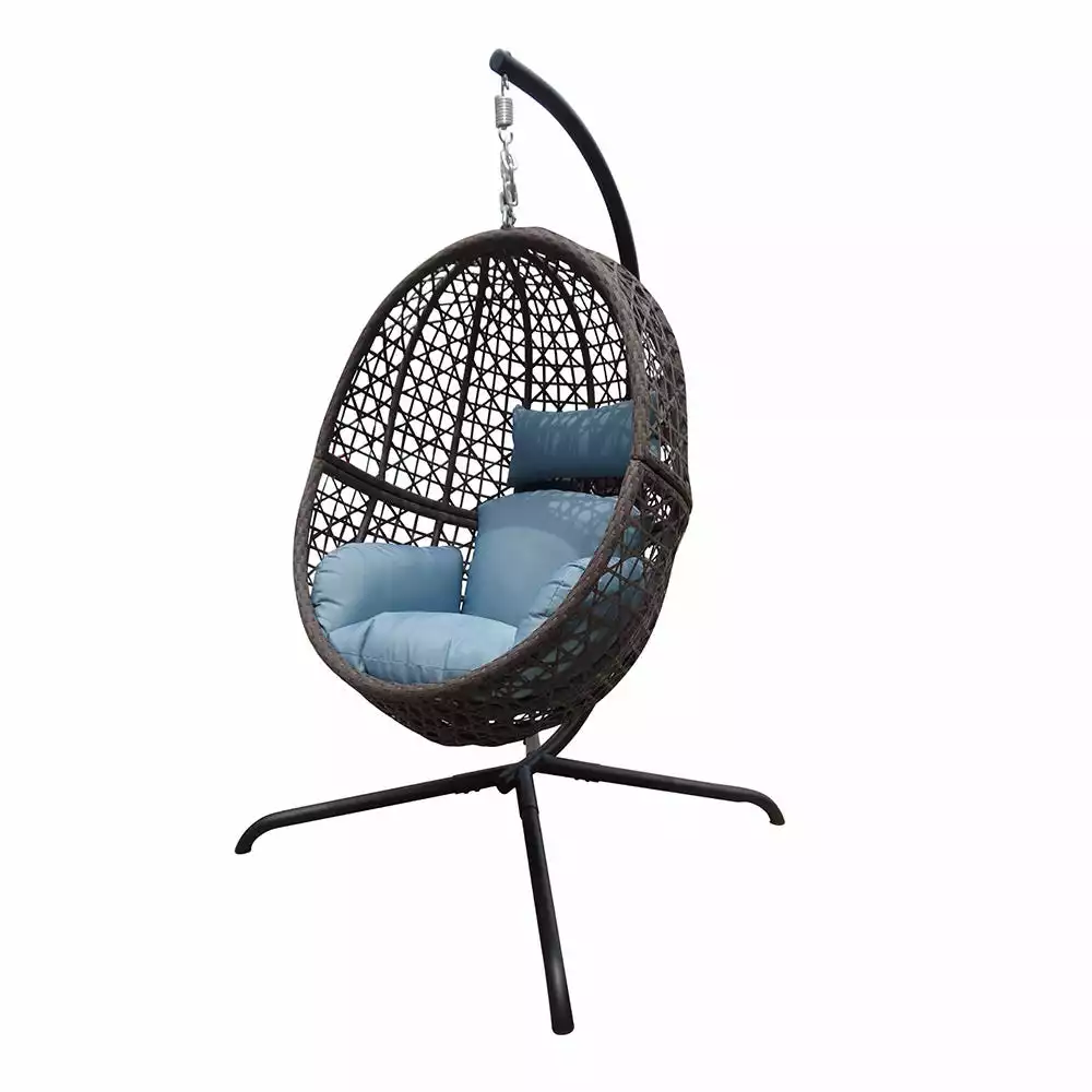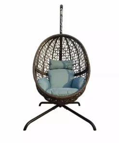 This Hanging Egg Swing Chair comes with a soft deep fluffy cushion, perfect for you to snuggle up on a warm and sunny day with a book and a coffee. The seat and frame of the hanging chair is constructed of polyethylene rattan resin wicker wrapped around an aluminum frame for weather-resistant protection and a powder-coated steel standing pole for strength and durability. This unique swinging chair is the perfect addition to any space, like a backyard patio, deck, sunroom, garden, near a pool or outdoor bar. This chair and stand are simple to put together. Everything you need is in the box, including the chair, headrest pillow, seat cushion, and stand. Chair provides a relaxing seat for one person.