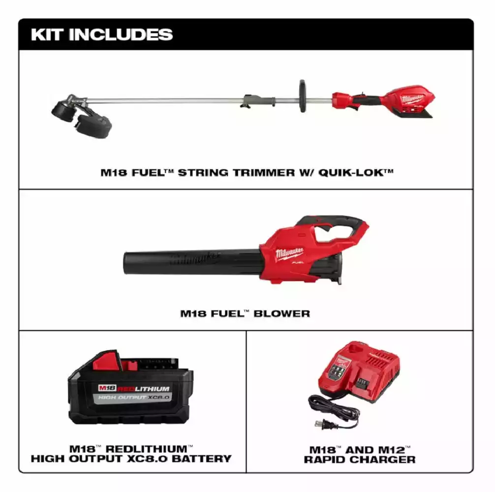 The MILWAUKEEยฎ M18 FUELโข 2-Tool Combo Kit delivers more power and reaches full throttle in under 1 second with no gas headaches. Included is the M18 FUELโข String Trimmer w/ QUIK-LOKโข, which is part of the M18 FUELโข QUIK-LOKโข Attachment System, featuring five compatible attachments. The trimmer is capable of up to 6,200 RPM with up to a 16โ cutting swath and delivers the power to clear thick brush. The motor is positioned in the rear of the trimmer to provide the best combination of power, balance, and maneuverability. Also included is the M18 FUELโข Blower, which delivers up to a 450 CFM and 120 MPH output. The blower features a variable speed trigger and high/low-speed settings for increased control. The M18 FUELโข String Trimmer and Blower are a part of the M18โข System, which is fully compatible with over 200 solutions.
