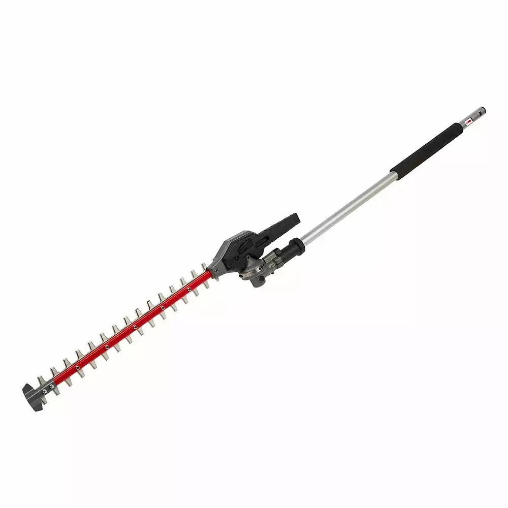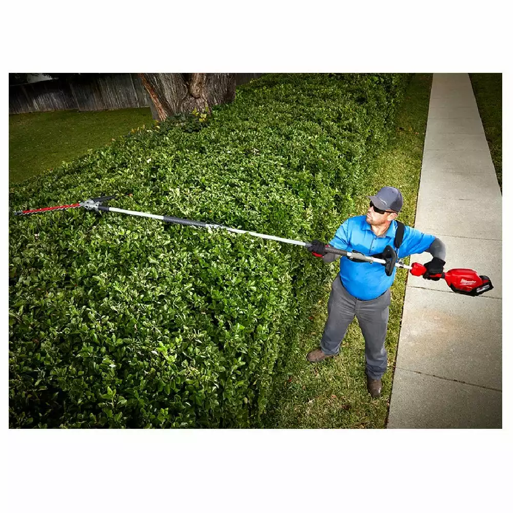 The MILWAUKEE® M18 FUEL™ QUIK-LOK™ Articulating Hedge Trimmer Attachment is powered by the M18 FUEL™ Power Head w/ QUIK-LOK™ and is compatible with the M18 FUEL™ QUIK-LOK™ Attachment System. The attachment’s articulating mechanism allows for 270° rotation of the blade set, which offers 13 operating positions and 1 storage position. The hedge trimmer attachment has a 20″” blade with 1″” cut capacity, clearing more material in a single pass. The hedge trimmer head includes a tip guard to prevent damage to the blade and surrounding work area, as well as a padded grip for optimal hand placement and increased comfort. The QUIK-LOK™ Attachments have protected drive shafts for increased durability against drops and storage elements. The hedge trimmer attachment also has optimized gearing to manage the cordless M18 FUEL™ Power Head RPM output specifically for hedge trimming applications.