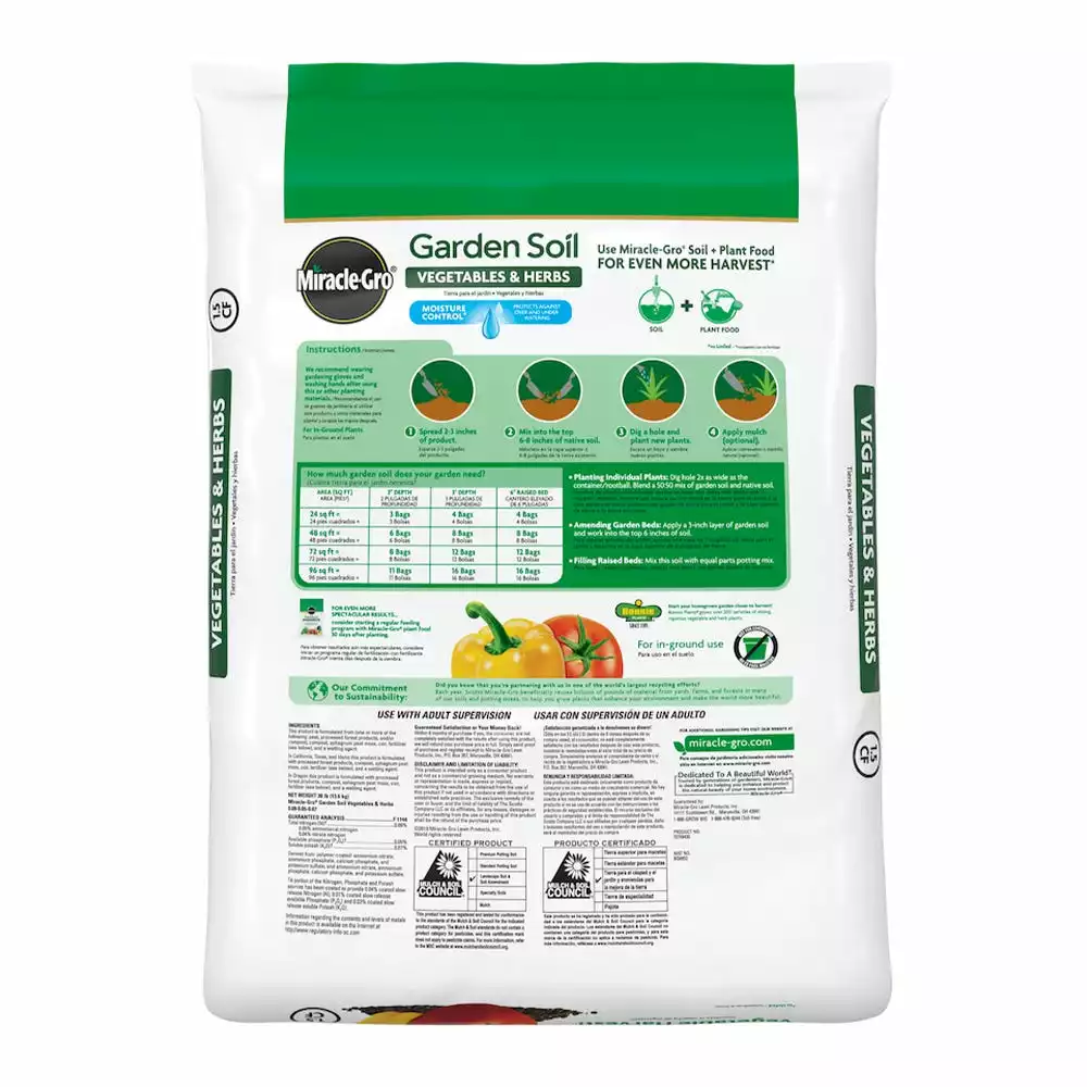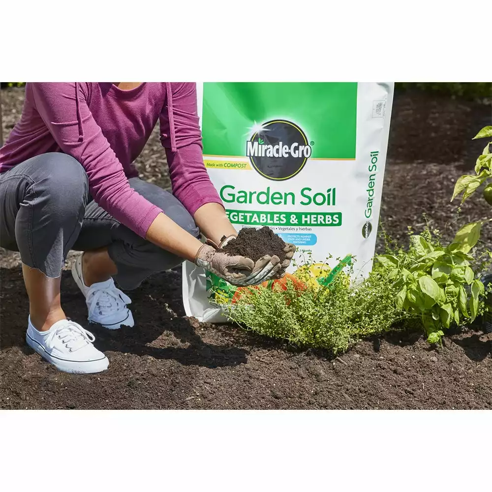 Grow a bountiful harvest with Miracle-Gro Garden Soil Vegetables and Herbs! Enriched with a blend of compost, plant food and other essential nutrients, it will feed plants for up to 3 months. Plus, Moisture Control technology protects against over and under watering. For even more harvest, start a regular feeding program with Miracle-Gro Plant Food 30 days after planting.