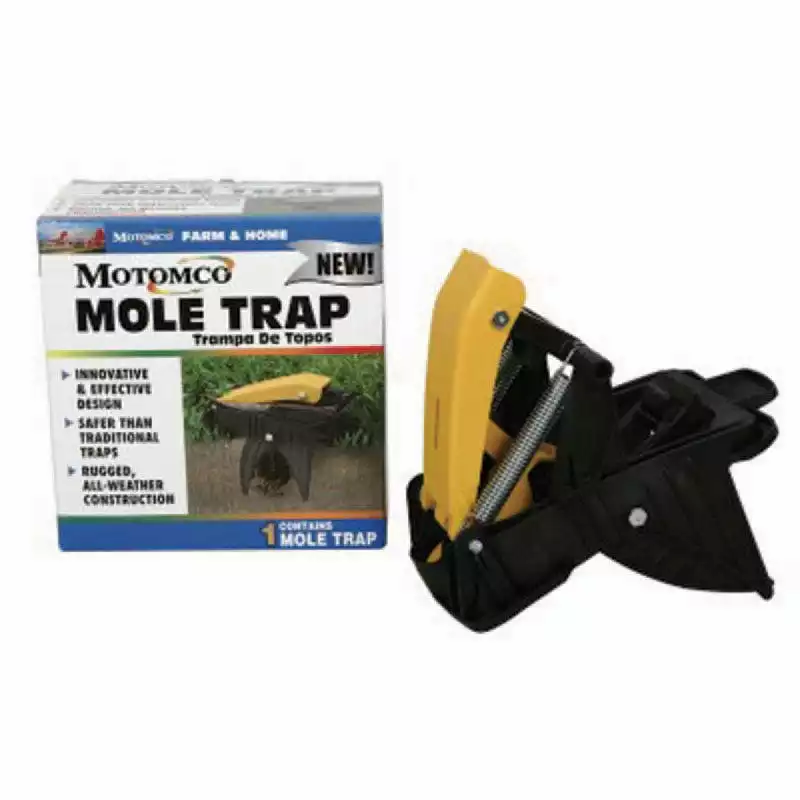 Professional grade quality and innovative design make the Motomco Mole Trap your best choice for capturing and killing moles.Β Β Made from heavy duty, glass filled nylon, the durable construction won’t rust and can be used again and again.Β Β Motomco Mole Trap is safe and easy to use and is easily set with a foot pedal that springs back once a mole has been caught.Β Β Simply place the curved jaws over the top of an active runway, step down on the foot pedal and moles will trigger the trap.