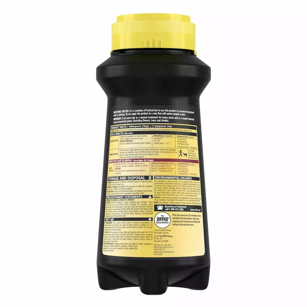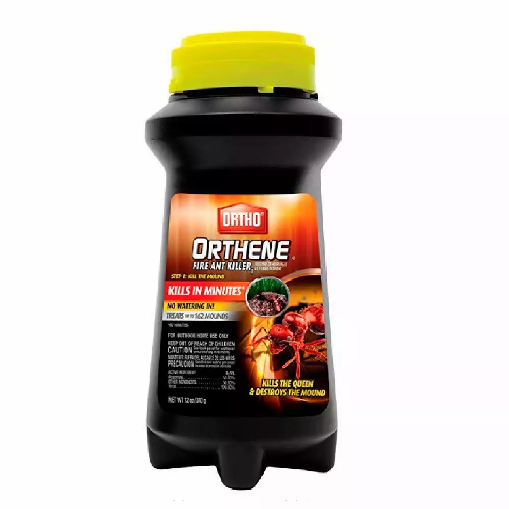 Don’t let fire ants keep you from enjoying your lawn. Stop the takeover by killing the queen and destroying the mound with Ortho Orthene Fire Ant Killer. This powerful, easy-to-apply solution destroys the mound and kills the queen to keep the colony from repopulating. It begins killing in 60 minutes, so you can get your yard back fast. One bottle can treat up to 162 mounds. Simply sprinkle powder over the mound and let it work its magic β no need to water-in. Use it as a mound treatment for home lawns and around ornamental plants (including flowers, shrubs, and trees). Follow label instructions to determine how much product is needed based on mound size. For best results, apply product while ants are active. To keep fire ants at bay, use as part of the Ortho 2-Step System – use Ortho Fire Ant Killer Broadcast Granules (sold separately) as a second step to prevent new mounds from forming for up to 6 months.