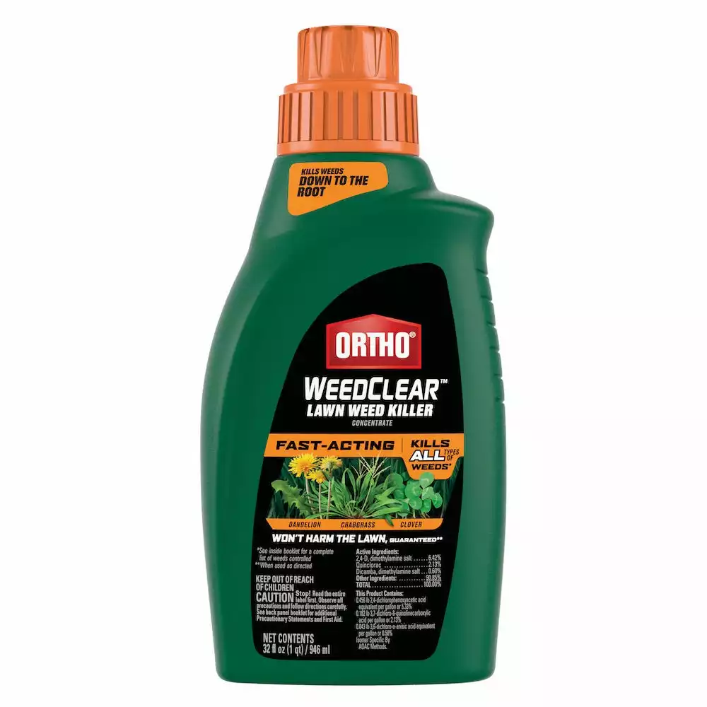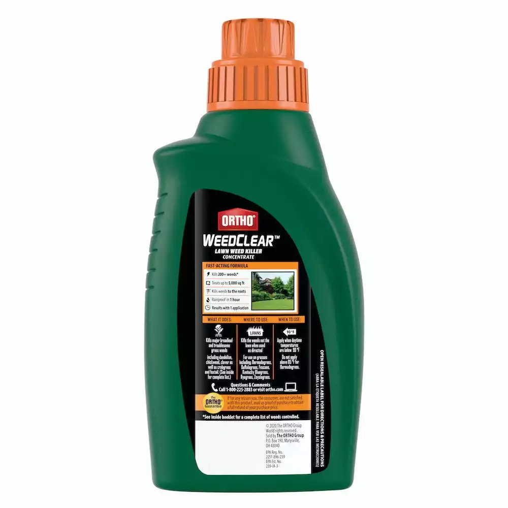 Kill weeds down to the root without harming your lawn (when used as directed)! Ortho WeedClear Lawn Weed Killer Concentrate kills and suppresses the growth of over 200 types of weeds, all major broadleaf weeds (see label for complete weed list) like dandelion, chickweed, clover, crabgrass, and foxtail. The fast-acting formula is rainproof in one hour and delivers visible results after just one application. The herbicide is specially formulated to kill weeds to the roots and won’t harm the lawn when used as directed. To use, mix this concentrated formula as directed on the label and apply with an Ortho Dial N Spray or tank sprayer. Apply when weeds are young and actively growing. Can be applied on multiple lawn and turfgrass varieties, including Bermudagrass, Buffalograss, Tall and Fine fescues, Kentucky Bluegrass, Ryegrass, and Zoysiagrass. Each bottle creates 12.8 gallons of ready-to-use weed killer that can cover up to 5,000 sq. ft. entire lawn. People and pets may re-enter once treated area has dried.
