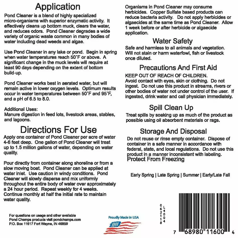 Adding Pond Champs beneficial pond bacteria to your pond not only helps break down muck and dead vegetation on the pond floor, it also helps neutralize nitrates and phosphates, two things that can feed the growth of unwanted weeds and algae. Our liquid pond bacteria product, Pond Champs Pond Cleaner, will help keep your pond clear of muck and sludge. Our pond bacteria consists of safe and natural bacteria that helps maintain pond muck levels, dead leaves, odors and other organic material that can hurt the healthy balance of your pond or lake.