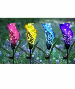Catch and measure the rain while adding a beautiful garden display with Alpine’s solar calla lily metal and glass rain gauge garden stakes. This rain gauge garden stake features a colorful calla lily design with warm white lights that last last up to 6 hours on one full charge. These stakes look great in the daylight, nighttime and capture rain!