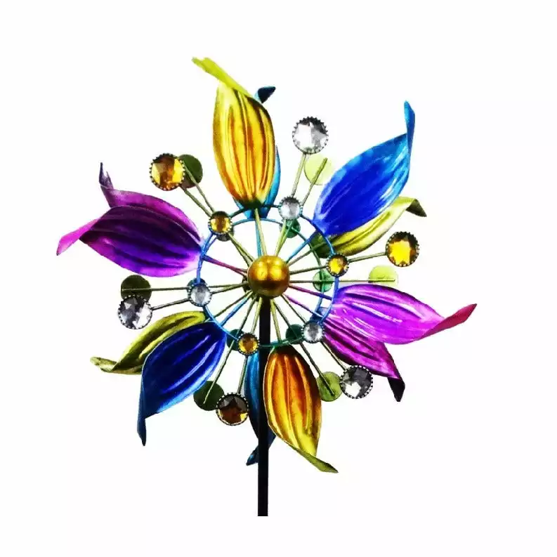 This beautiful colorful metal with jewels creates a mesmerizing spinning effect in your yard or garden. Let the wind catch the blades and the fun begins.