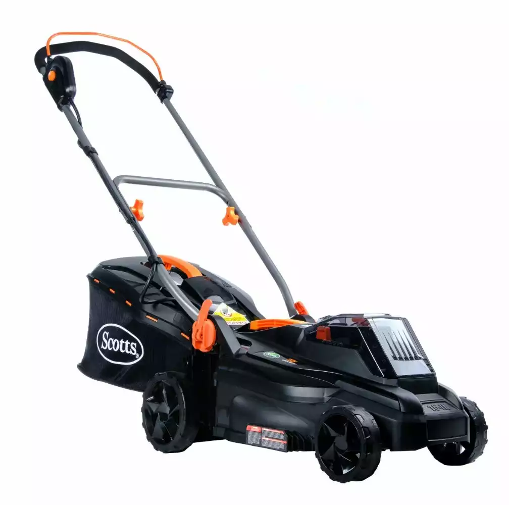 This Scott’s 16″ 20V Lithium Ion Lawn Mower can be adjusted to 5 different cutting heights, ranging from 1″ to 2.5″. With a steel handle and poly mowing deck, this single-speed mower offers both bagging and mulching and includes a 1 Bushel hard-top fabric sided collection bag. Plus, it’s equipped with a push-button start with safety switch and a cushioned grip for your comfort. No tools required for assembly.