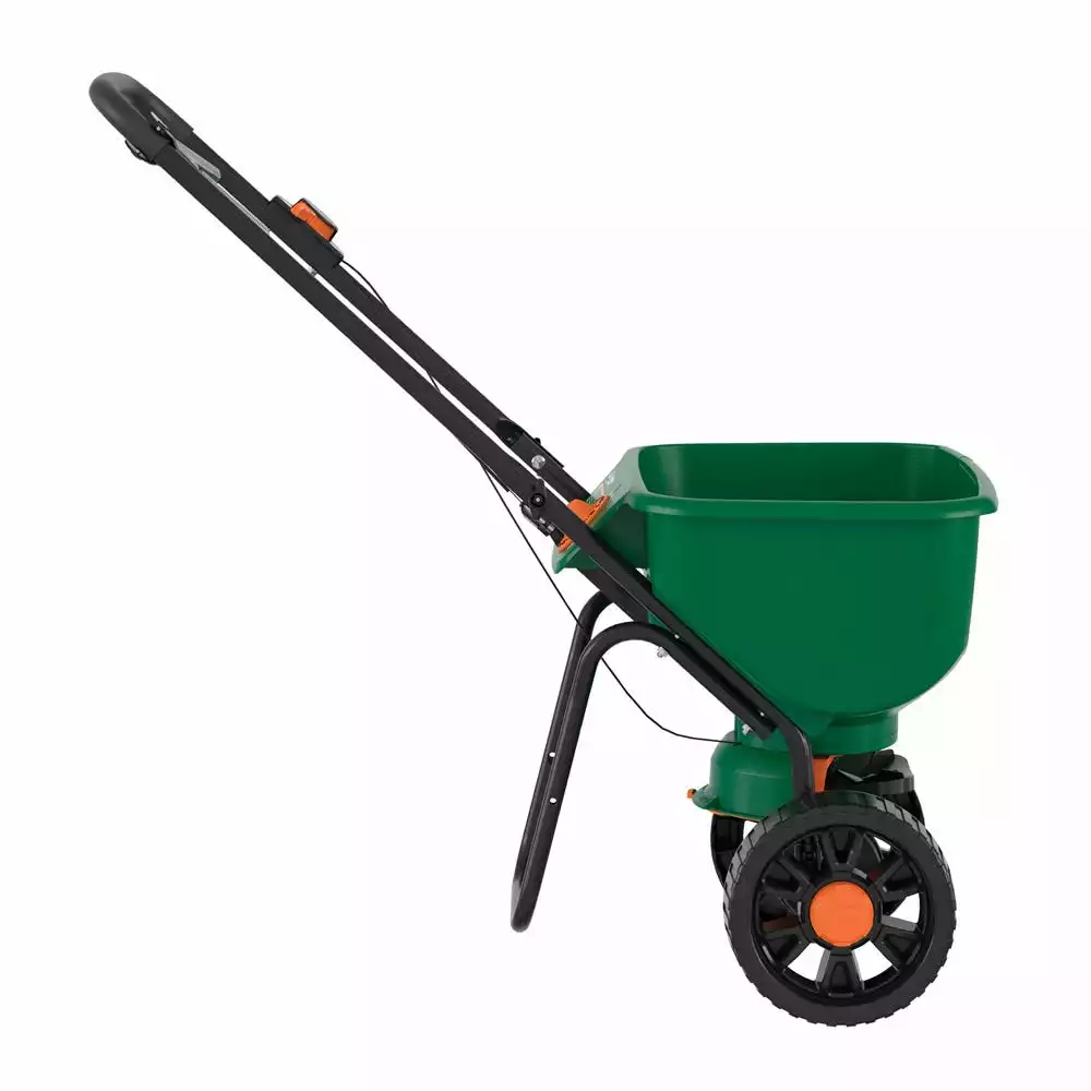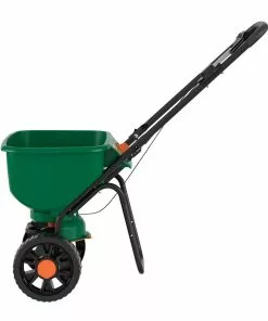 Use the Scotts Turf Builder EdgeGuard DLX Broadcast Spreader to apply fertilizer, grass seed, and other lawn care products. This lawn spreader comes pre-calibrated and ready-to-use, and holds up to 15,000 sq. ft. of Scotts product. When EdgeGuard is engaged, it will block off the right-side of the spreader pattern to prevent product from spreading onto non-lawn areas. Using the Scotts Turf Builder EdgeGuard DLX Broadcast Spreader is simple. To begin, turn rate control dial to the correct setting listed on the back of each Scotts product, pour the product in the hopper, then start spreading. The spreader’s design enhancements feature a curved hopper and dual-bladed agitator for smooth product funneling and consistent coverage. Spreaders provide uniform coverage of granular products; without one, you may end up with uneven coverage of fertilizer or control products that can result in uneven feeding, weed, disease, or insect control. Scotts spreaders can also be used to distribute salt on walkways and driveways.