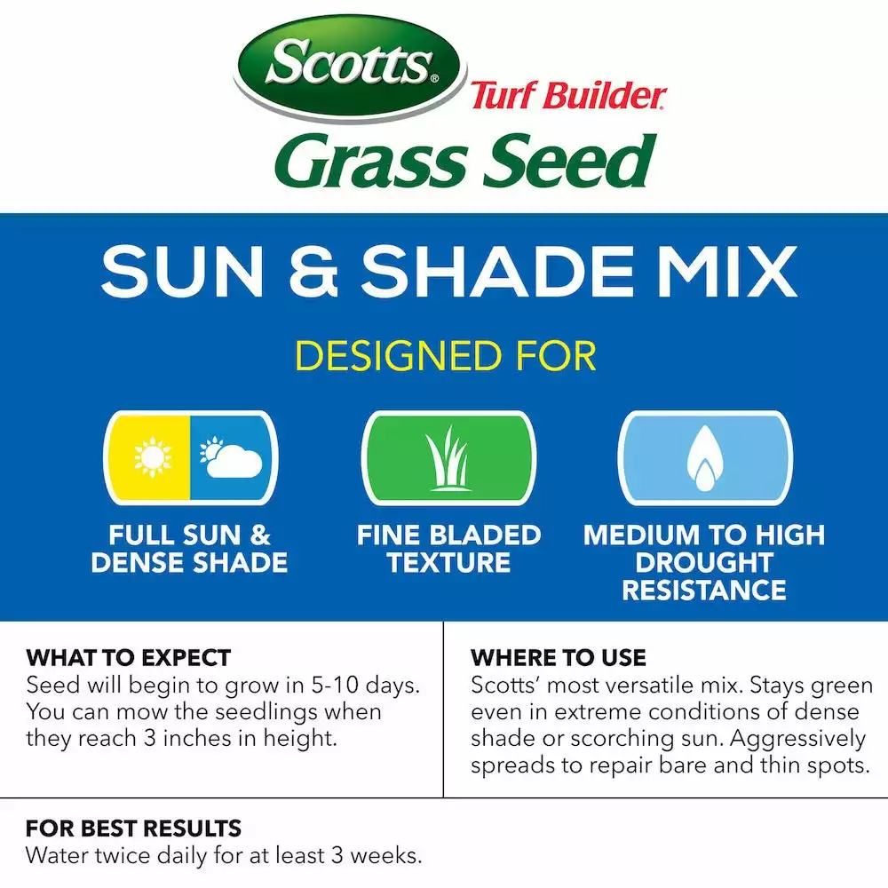 Scotts Turf Builder Grass Seed Sun & Shade Mix is Scotts most versatile mix that stays green even in extreme conditions of dense shade or scorching sun. Scotts wraps each seed in a unique 4 in 1 WaterSmart PLUS Coating that absorbs 2x more water than uncoated seed, feeds with essential nutrients, and helps protect seedlings from disease. Grow Quicker, Thicker, Greener Grass. Guaranteed.