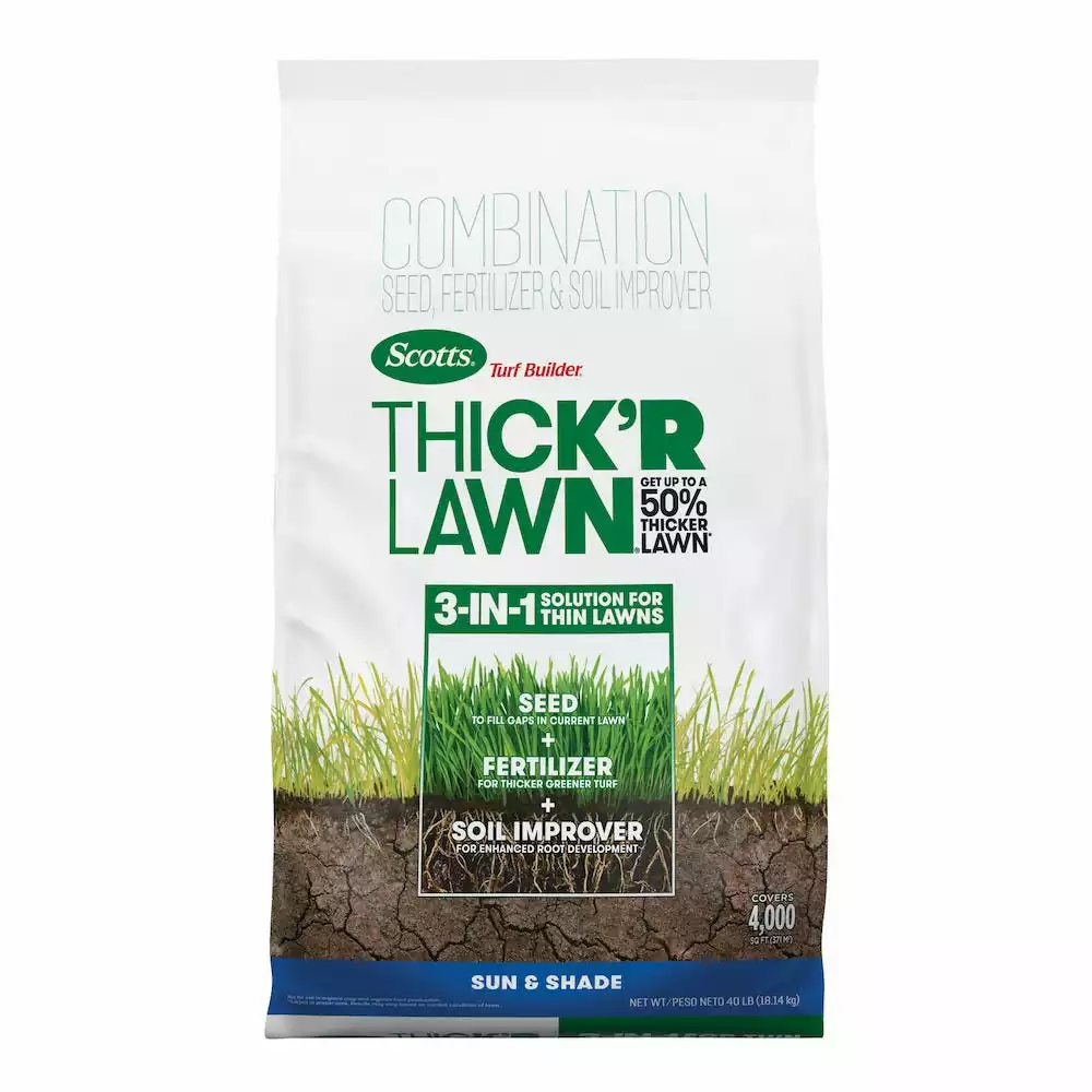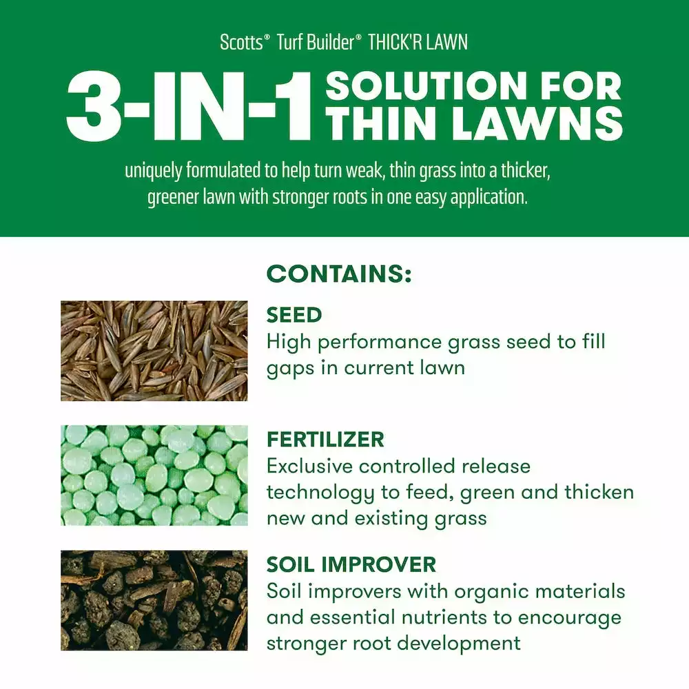 Scotts Turf Builder Thick’R Lawn Sun and Shade has everything you need to help turn weak, thin grass into a thick, green lawn. With this 3-in-1 solution get up to a 50% thicker lawn with just one application (subject to proper care)! THICK’R Lawn contains soil improver for enhanced root development, seed to fill gaps with new grass, and fertilizer to feed new grass and thicken and green existing turf. This product is intended for use on an entire lawn and can be applied easily with a Scotts spreader. Results may vary based on current condition of lawn.