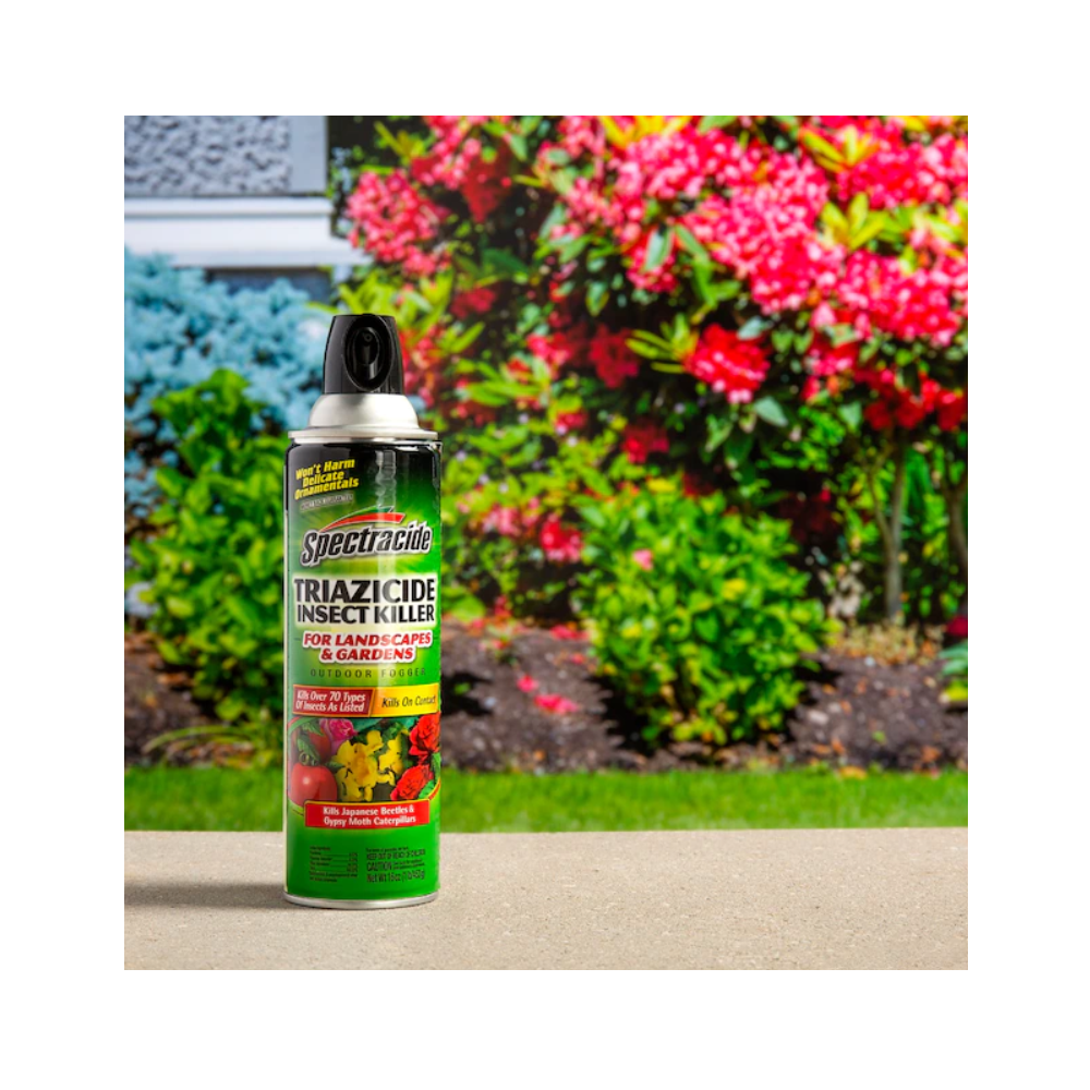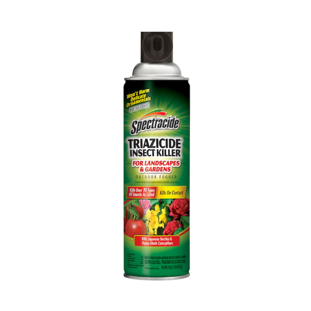 The power is in your hands to keep your landscape in line β unleash it with Spectracide lawn and garden products. Our easy-to-use, fast-acting insect, lawn disease and weed control solutions help you tame lawn and landscape invaders with incredible pest-punishing power. Take command with Spectracide brand. You hold the power. Spectracide Triazicide Insect Killer For Landscapes and Gardens Outdoor Fogger kills over 70 types of insects as listed on contact, including Japanese beetles and gypsy moth caterpillars. The fogging spray protects landscapes and gardens, and is ideal for use on most vegetables, herbs, fruits and nuts, and garden ornamentals as listed. It wonβt harm delicate ornamentals when used and stored as directed. This formula kills listed garden insects, including ants, sod webworms, aphids, beetles, whiteflies, fleas, mites, stink bugs, deer ticks, crane flies and others (see product label for complete list)(. Spray with the can 18 to 24 inches away from the foliage to be treated; apply to provide thorough coverage of upper and lower leaf surfaces. Repeat treatment weekly or as needed to control infestations. One 16 ounce can treats 20 square feet of surface area.