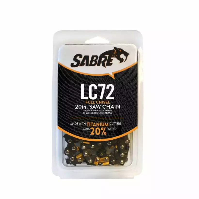 Sabre’s LC72 chain is a full chisel 3/8β pitch chain with hardened, chrome and titanium coated cutters designed for high-speed, excellent chip clearance in clean conditions. Sabre full chisel chain cuts 20% faster than semi-chisel chain. The full chisel chain is preferred by professional users. Sabre chain features the Centri-Lubeβ’ oil distribution system. Centri-Lubeβ’ pulls oil from the bar and distributes to the chainβs rivets reducing stretch, limiting field adjustments, and extending the life of the chain.