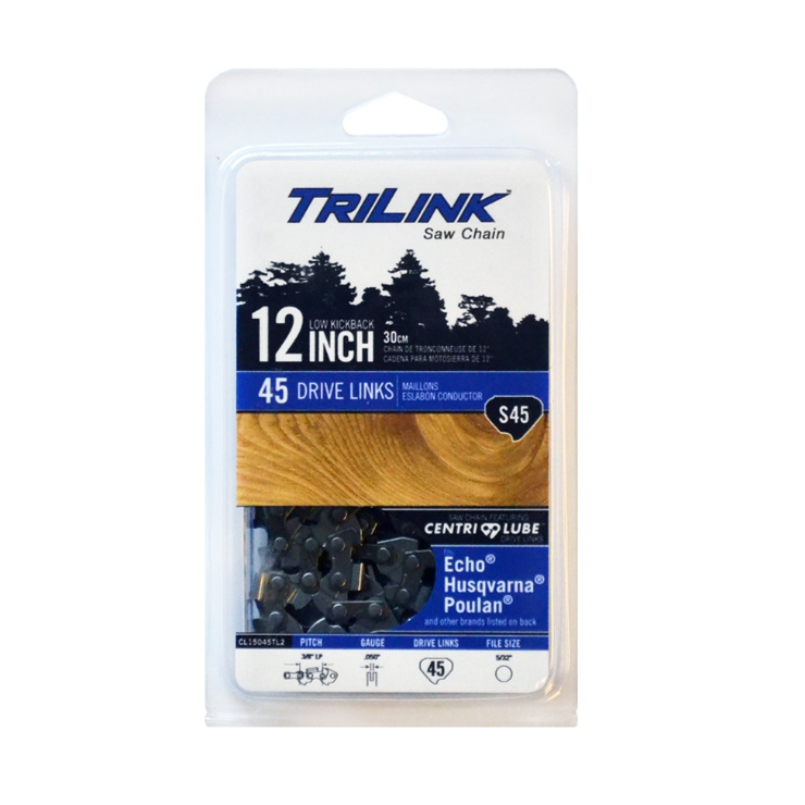 TriLink saw chain has chromed cutters for fast, smooth cutting and low kickback design for safety and durability; Please see fit up guide for complete list of compatible chainsaws; Underwriterβs laboratories (UL) certified to American National Standards Institute (ANSI) standards for low kickback safety chain; Centri-lube self-lubricating drive links that enhance chain life and reduce stretch
