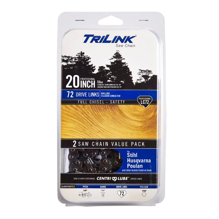 TriLink saw chain has chromed cutters for fast, smooth cutting and low kickback design for safety and durability; Please see fit up guide for complete list of compatible chainsaws; Underwriterβs laboratories (UL) certified to American National Standards Institute (ANSI) standards for low kickback safety chain; Centri-lube self-lubricating drive links that enhance chain life and reduce stretch