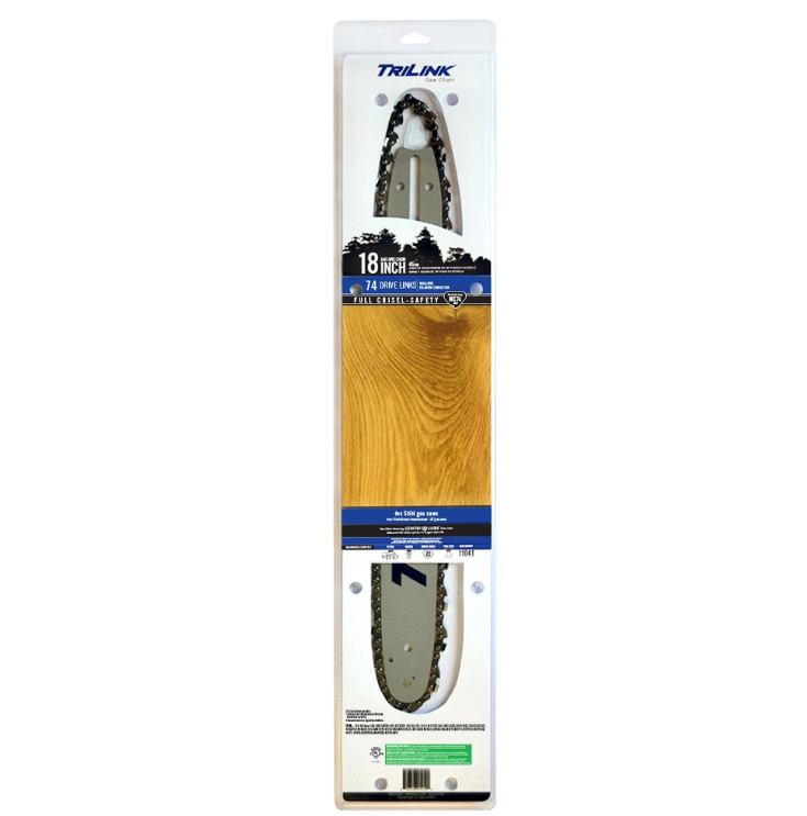 Light weight design for faster cutting and reduced user fatigue; Please see fit up guide for complete list of compatible chainsaws; Saw chain is certified by underwriter’s laboratories (UL) to meet all American National Standards Institute (ANSI) standards for low kickback chain; Centri-lube self-lubricating chain provides for longer life, less stretch and reduced heat buildup in the bar and chain; Secure with 4 rivets to the sprocket nose for resistance to the nose opening; Includes TriLink chain and TriLink guide bar