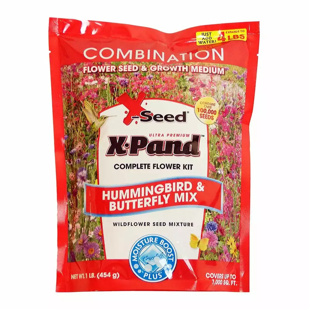 Β This one-pound bag of X-Seedβs X-Pand Hummingbird and Butterfly mix contains 100,000 flower seeds which will produce nectars that attract hummingbirds and butterflies. The plants will grow to a height of 30-40 square inches, and thereβs enough seed in this bag to cover 1,000 square feet. The mix also contains fertilizer, starter nutrients, and soil that helps hold moisture.